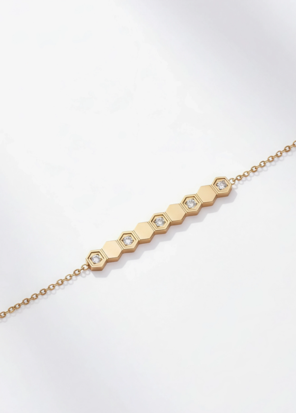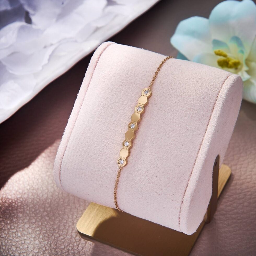 Bracelet fin doré à motifs hexagonaux style alvéole (bee), serti de zircons brillants. Élégant, féminin et parfait pour un look chic quotidien.