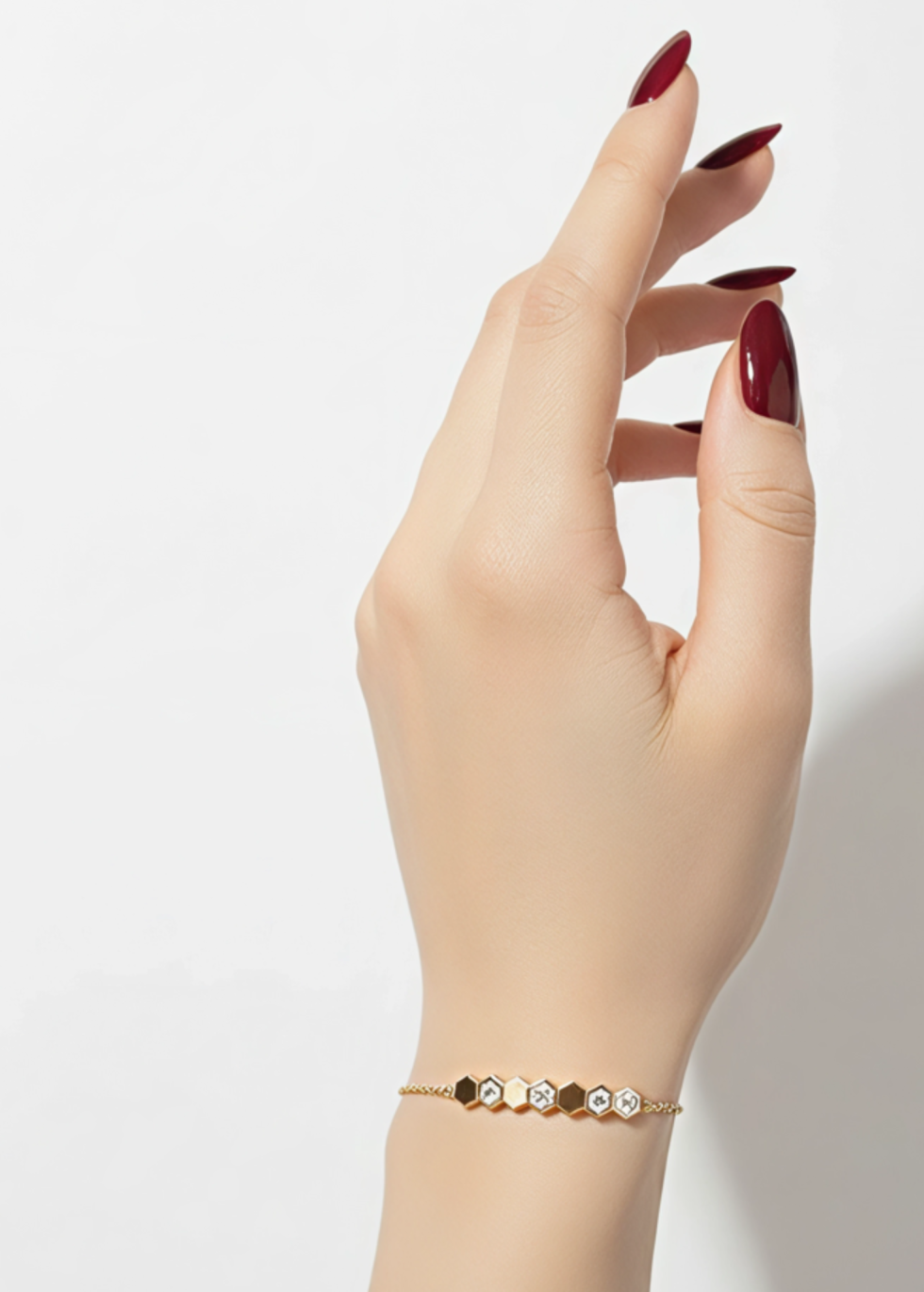 Apportez une touche de lumière et de finesse à votre style avec ce bracelet Bee Hexa doré, inspiré des formes hexagonales type alvéole. Son alignement géométrique délicat est rehaussé de zircons scintillants qui captent la lumière à chaque mouvement du poignet.